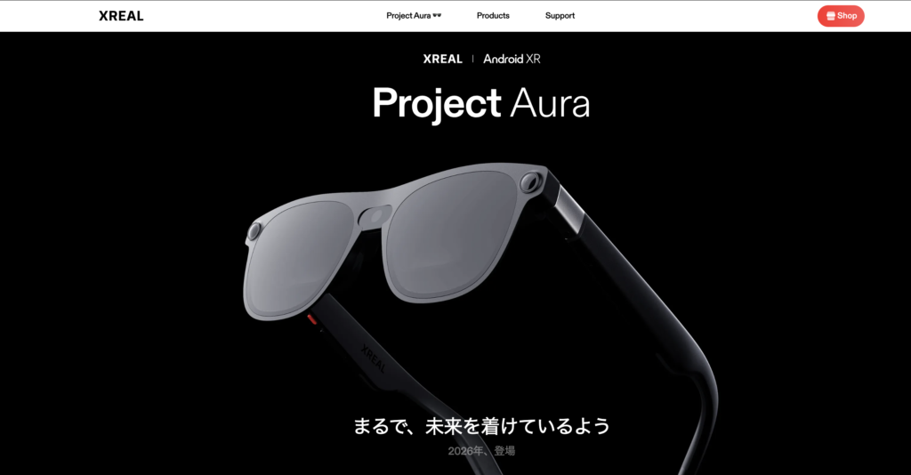 Project Auraとは、XREALがGoogleおよびQualcommと共同開発している、Android XR(拡張現実)プラットフォームを搭載した光学シースルー型ARグラス(スマートグラス)です。公式サイトでは、2026年に登場予定とされています。