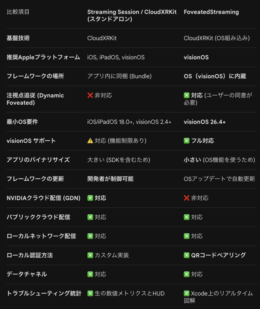 Foveated Streaming と Streaming Session / CloudXRKit (Standalone) の比較表