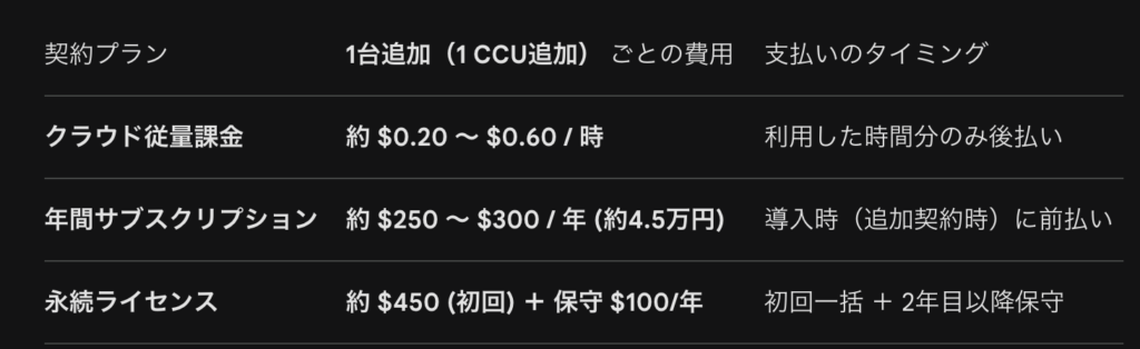 CloudXRを動かすために1デバイス(1同時接続)ごとに必要となるであろう想定されるライセンス金額です。